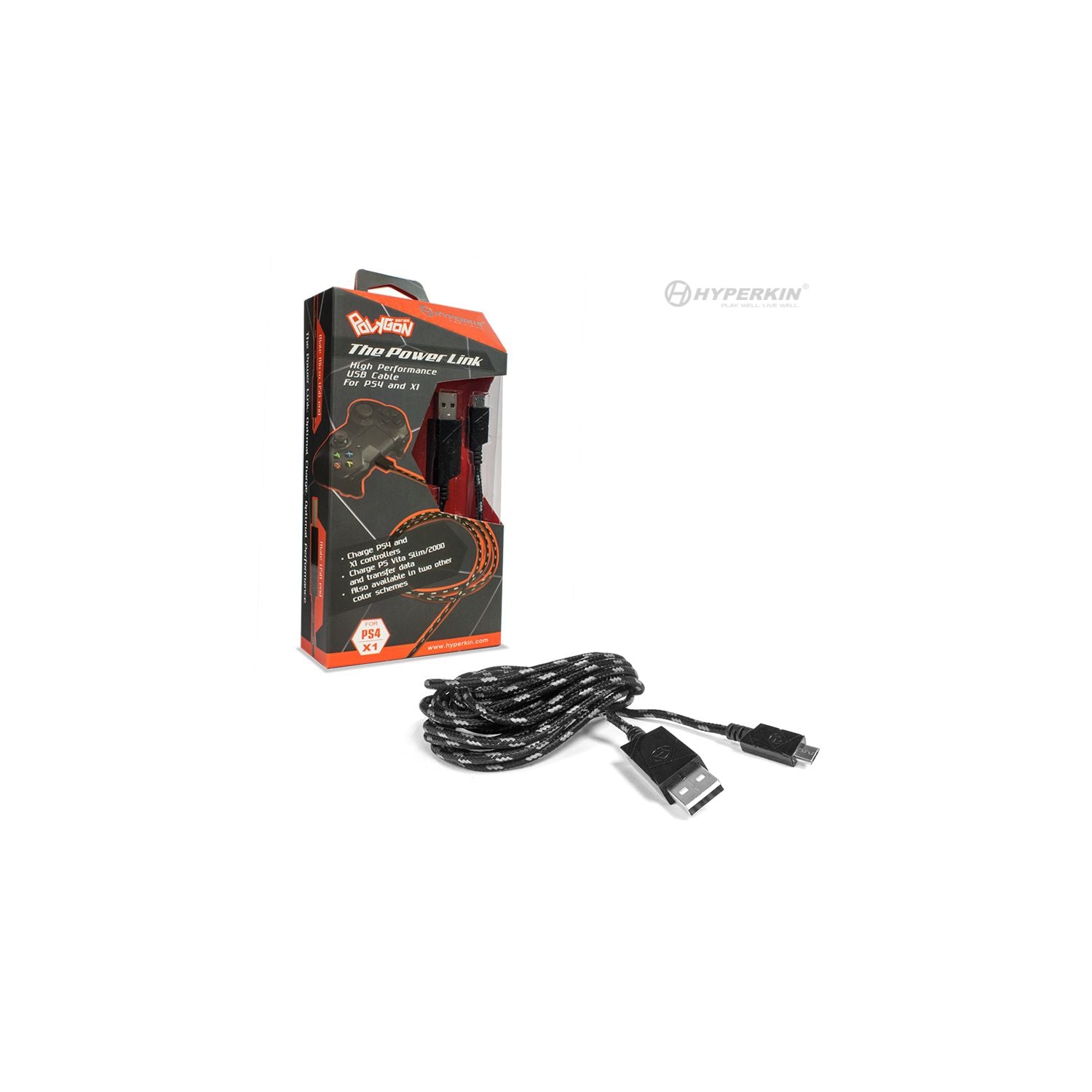 For sale is a New Hyperkin Polygon Braided Micro USB Charge Cable for PS4®/ Xbox One®/ PS Vita® Model 2000. Charge your controllers via their Micro ports. The cable can also be used to charge your handheld and transfer data here.